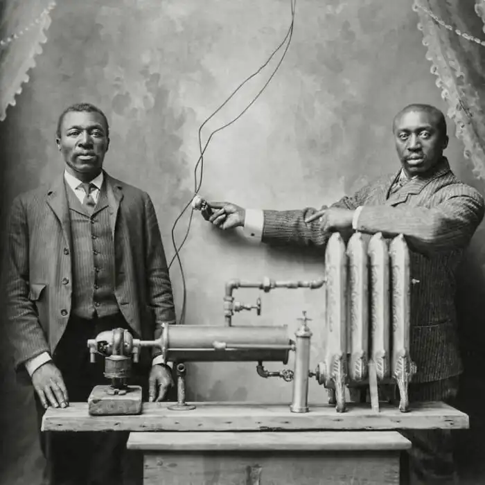 7. Изобретатель Чарльз С.Л. Бейкер и его помощник демонстрируют систему отопления/радиатор. 1906 год