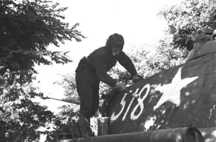 17. Советский танкист наносит опознавательные знаки и номер на трофейный немецкий танк Pz.Kpfw.V Ausf.A «Пантера».