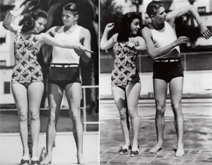 19. Рональд Рейган учит Сюзан Хэйуорд плавать. 1938 год