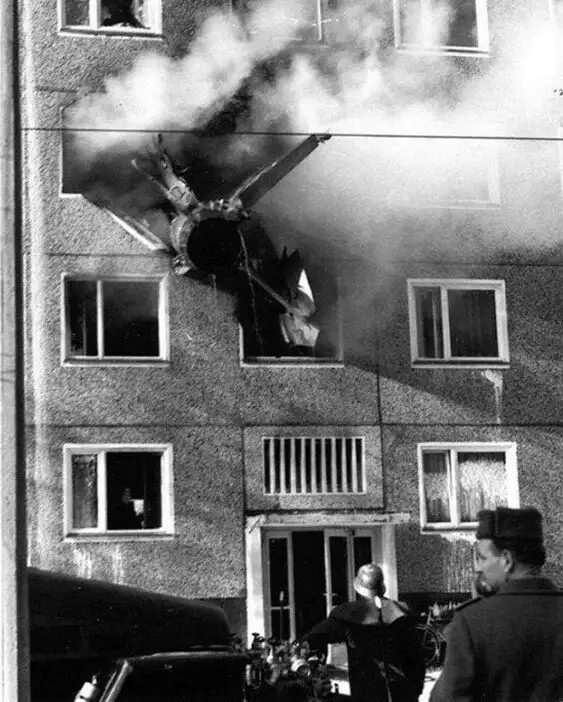 Майор Peter Makowicka остался в кабине, несмотря на три приказа катапультироваться. Летчик пытался увести самолет в сторону от густонаселенного района Котбус, ГДР.