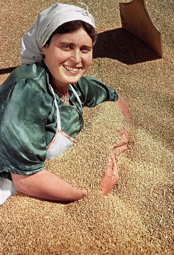 36. Богатый урожай пшеницы собран в колхозе имени Сталина Ново-Александровского района Ставропольского края. 1951 год