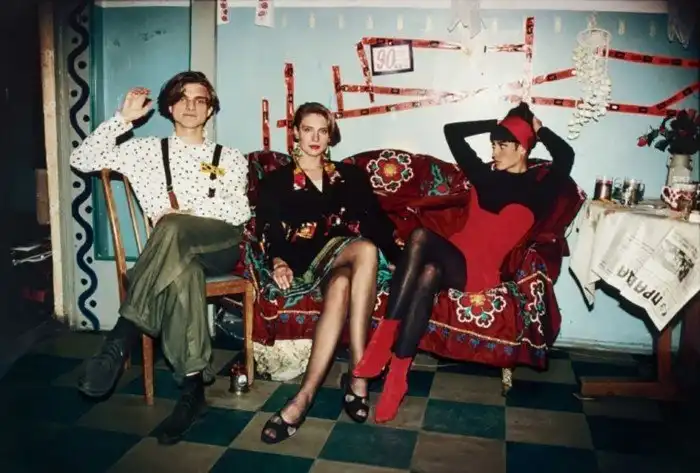 3. Дизайнер Константин Гончаров, жена Сергея Бугаева (Африки) Ирена Куксенайте и модель Кристи Тарлингтон в ленинградской квартире Африки для журнала Vogue US, 1990 год