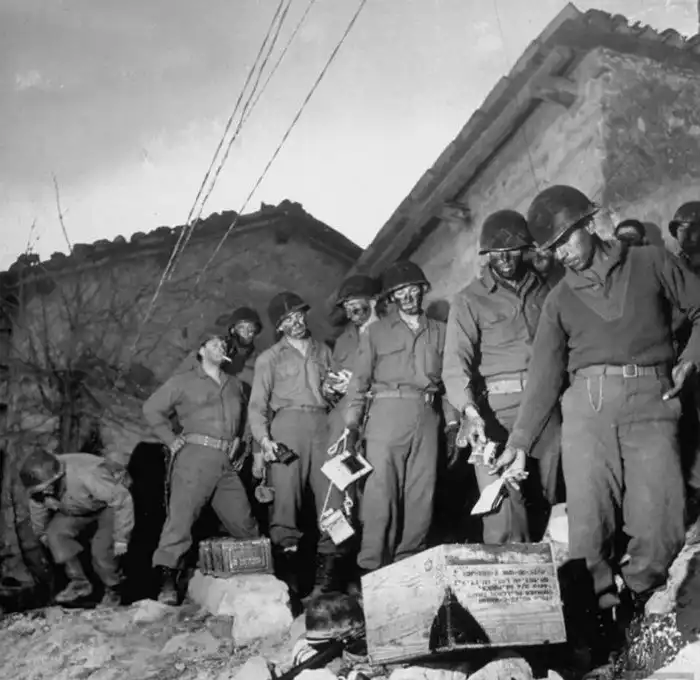 13. Американские пехотинцы бросают свои личные вещи в ящик, правила запрещают любую идентификацию, кроме бирок, при подготовке к ночному рейду на немецкие позиции. Италия. 1945 год