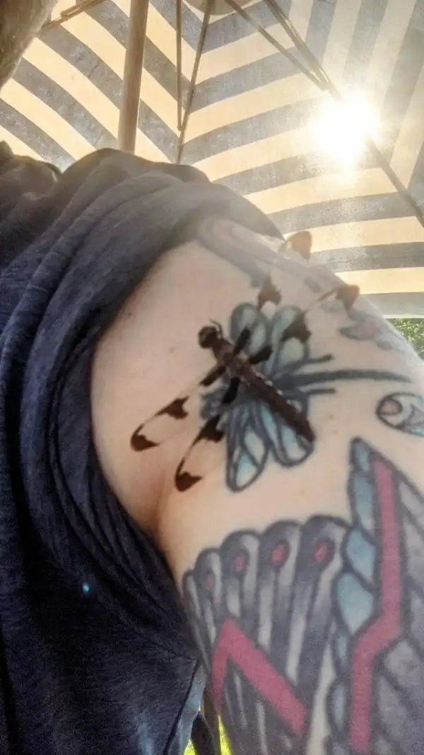 Стрекоза приземлилась на татуировку стрекозы