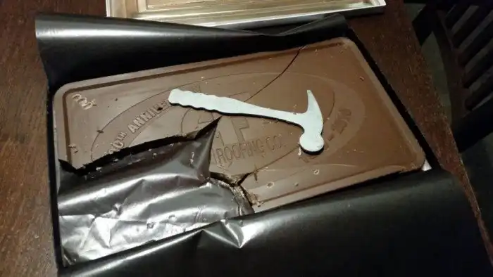 Гигантская шоколадка доставлена с молотком, чтобы разбить её на более мелкие кусочки