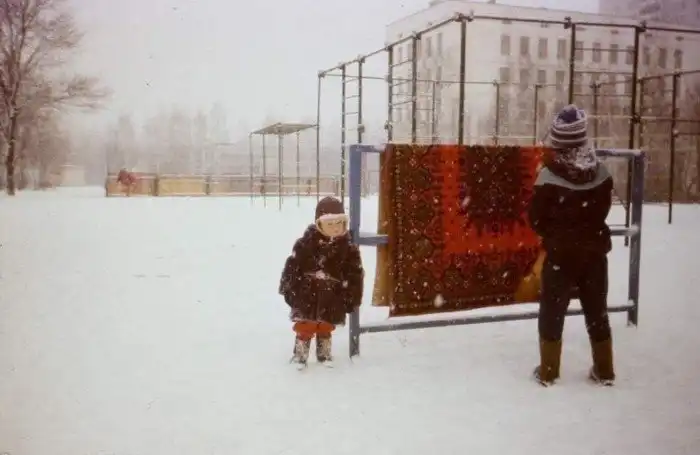19. В городских микрорайонах СССР, с наступлением морозов, первый большой снег был обязательно связан с выбиванием ковров на улице