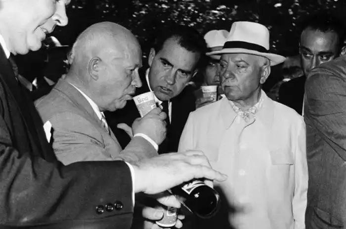 29. Никита Хрущев пробует Пепси в 1959 году на Национальной выставке США в Москве. За ним следят вице-президент США Ричард Никсон (в центре) и Дональд Кендалл (справа)