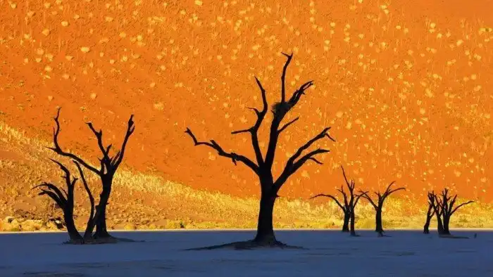 Несмотря на то, что всё это выглядит, как работа художника-экспрессиониста, перед вами реальный природный пейзаж. На переднем плане запечатлены мёртвые деревья, которые затмевает заходящее солнце, а позади расположены красные дюны Намибии.