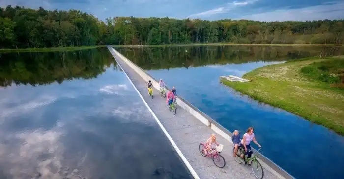 В Бельгии есть довольно интересная велосипедная дорожка длиной в 200 метров, проходящая через большой пруд в заповеднике. Что же в ней особенного? Во время езды лицо человека оказывается на одном уровне с водой, поэтому кажется, будто велосипедист заехал в пруд с головой.