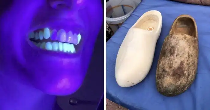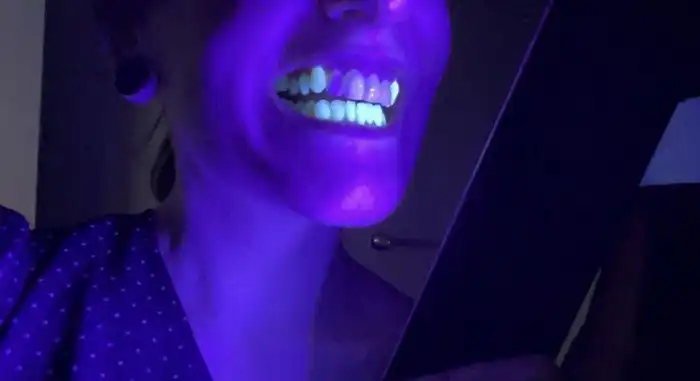 Обычные зубы светятся в ультрафиолетовом свете, а виниры — нет