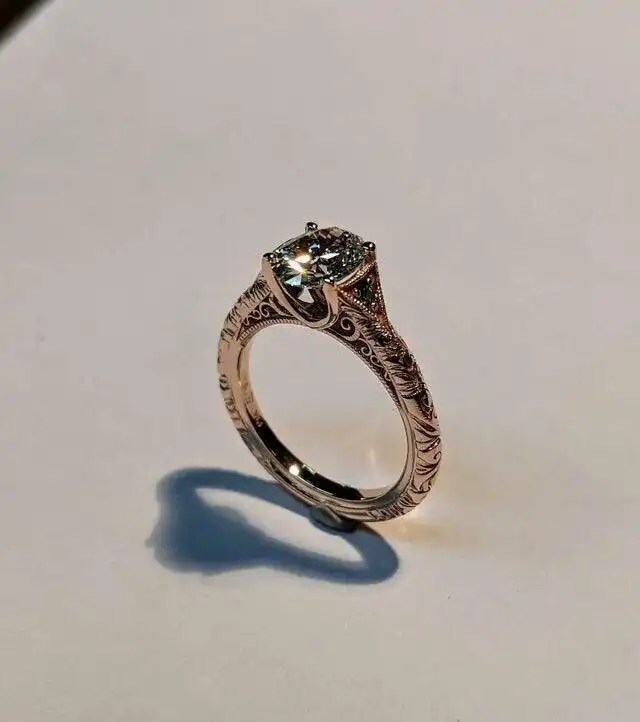 9. "Я сделала это помолвочное кольцо из 14-каратного розового золота с выращенным в лаборатории бриллиантом и двумя фиолетовыми сапфирами"
