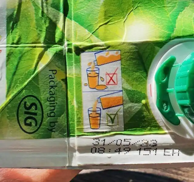 Эта упаковка сока объясняет, как аккуратно налить напиток