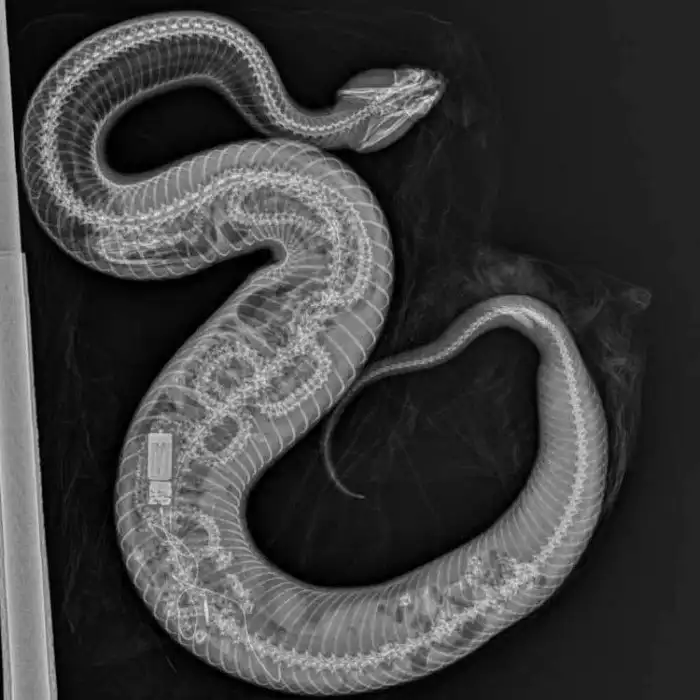 Крупный план клыков гремучей змеи (слева) и габонской гадюки (справа)