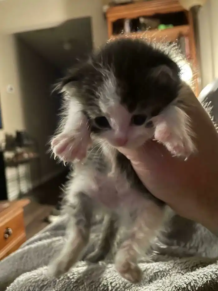 2. "Малой, которого я вчера вытащил из затопленного подполья. Его кормят из бутылочки, он поправляется и выглядит здоровым и счастливым"