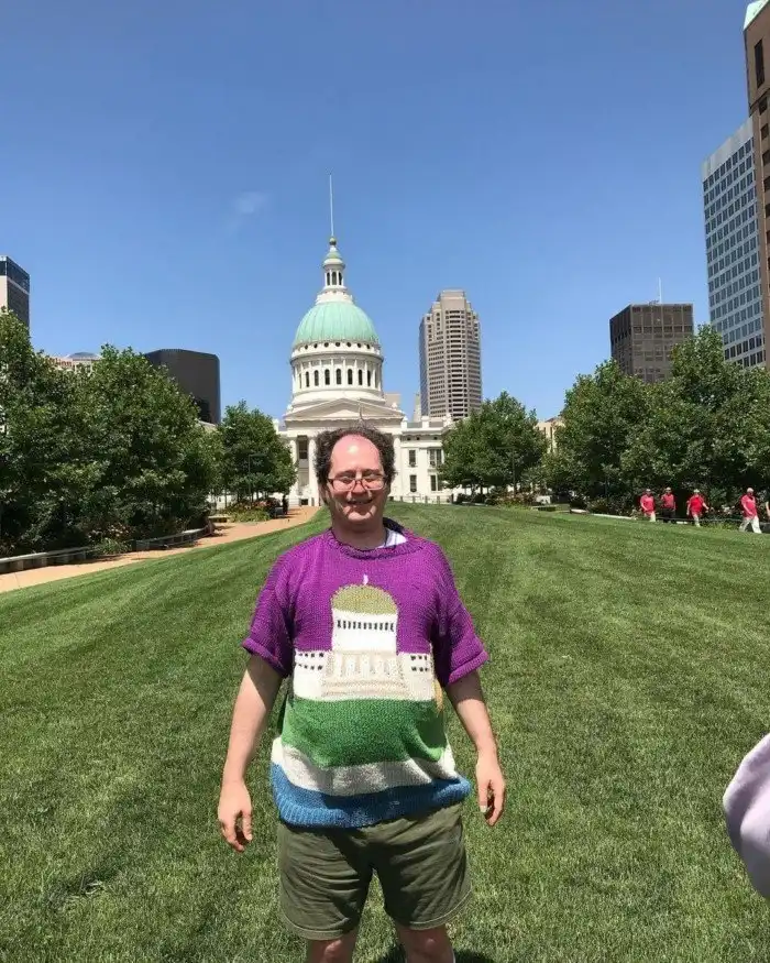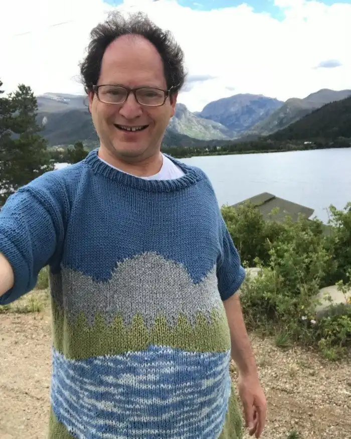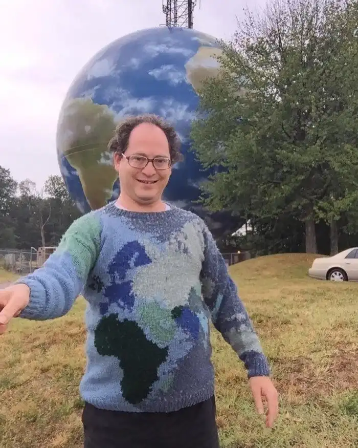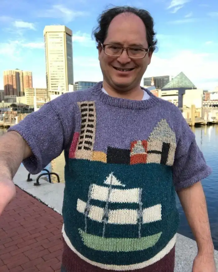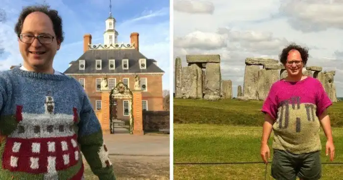 Каких только хобби не существует. При всём многообразии американский художник Сэм Барски выбрал для себя в качестве увлечения вязание. Да не просто носочки да шарфики, а свитера с изображением достопримечательностей, на фоне которых он потом и фотографируется.