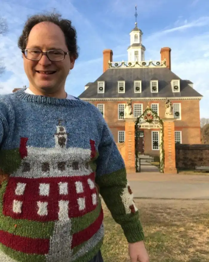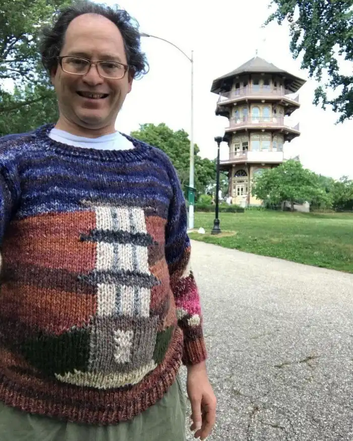 Этот свитер был связан специально для поездки туда летом 2018 года. Спереди изображён викторианский особняк, а сзади есть ещё и маяк.