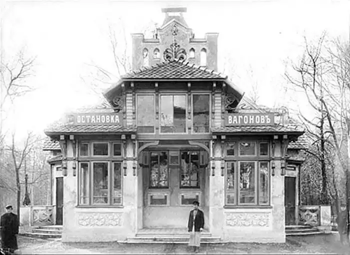12. Остановка трамвая с общественными туалетами (нач. 1910-х гг.) на Кронверкском проспекте в Петербурге. Снесена в 1960-х гг.