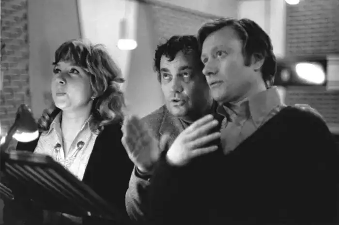 23. Режиссер Эльдар Рязанов и актеры Андрей Миронов и Наталья Гурзо. Озвучивание фильма «Приключения итальянцев в России», 1973 год
