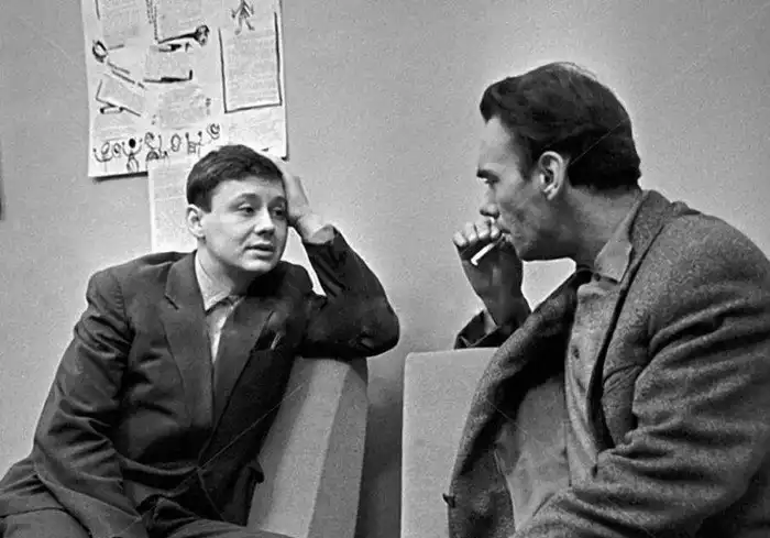 25. Алексей Баталов беседует с молодым актером Московского театра "Современник" Олегом Табаковым. 1962 год. Фото Бориса Кауфмана /РИА Новости