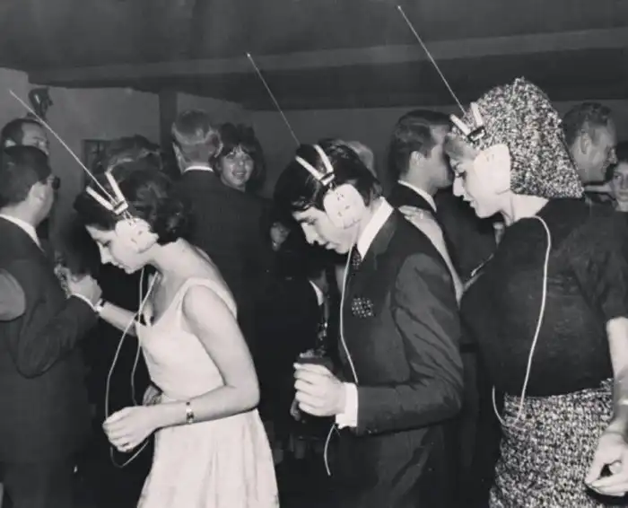 27. Hoчной клуб в Пapиже, где кaждый сам выбиpaeт под какую музыку танцeвать, настpaивая её в своих наушниках, 1963 год