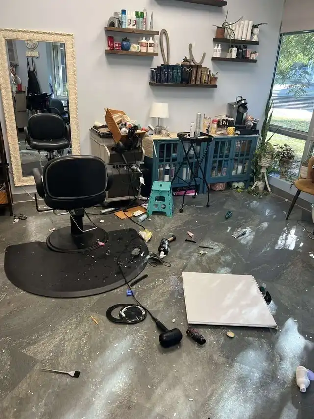 Нет, тут не произошло ограбление или недовольный стрижкой клиент устроил погром, просто взорвался баллончик с лаком