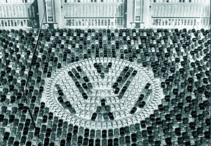 6. Инсталляция, устроенная в честь выпуска миллионного "Фольксвагена" заводом в Вольфсбурге, 1955 год