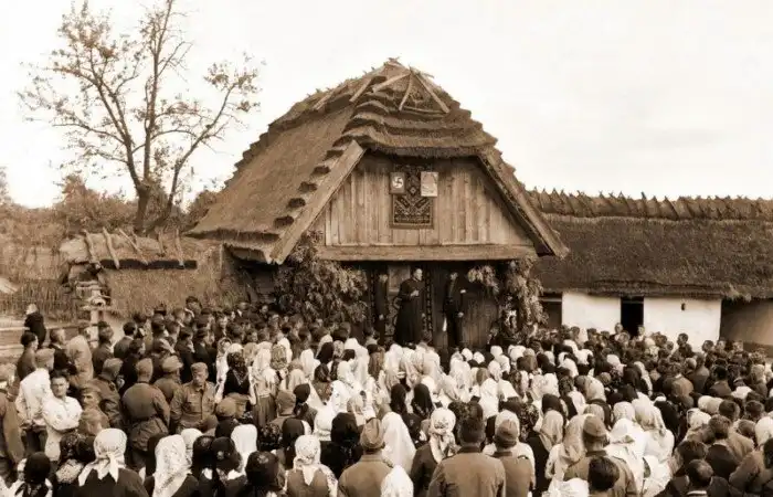 В толпе стоят так называемые "хиви", добровольцы, сотрудничающие с немецкой администраций (они и переводят речь священника с немецкого)