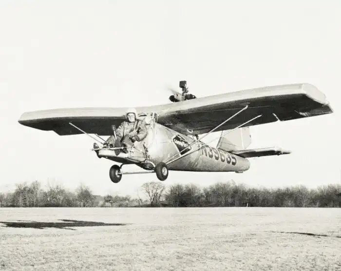 23. Пилот Дик Ульм испытывает надувной резиновый самолет с двигателем мощностью 40 л.с. США, 1956 год