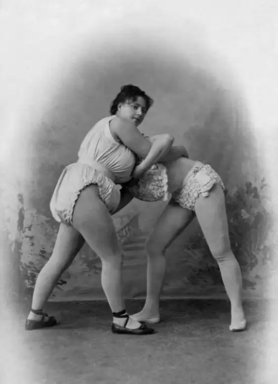 24. Борцы Мария Бир и Джули Франк выполняют «скручивающий захват» во время борьбы за титул чемпиона Европы по женской борьбе. 1901 год