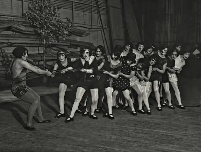 26. Женщина-силач Марта Фарра перетягивает канат с шестнадцатью соперницами, 1925 год