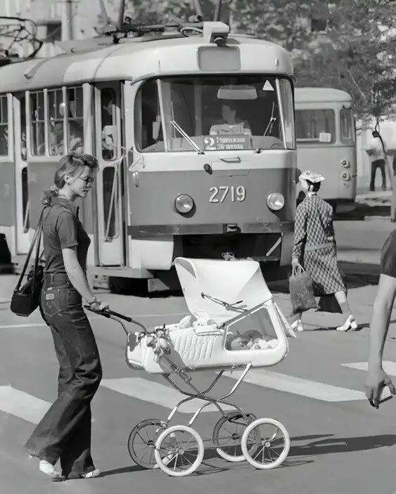 39. Модная мамочка на пешеходном переходе в Волгограде. СССР, 1 июня 1982 год