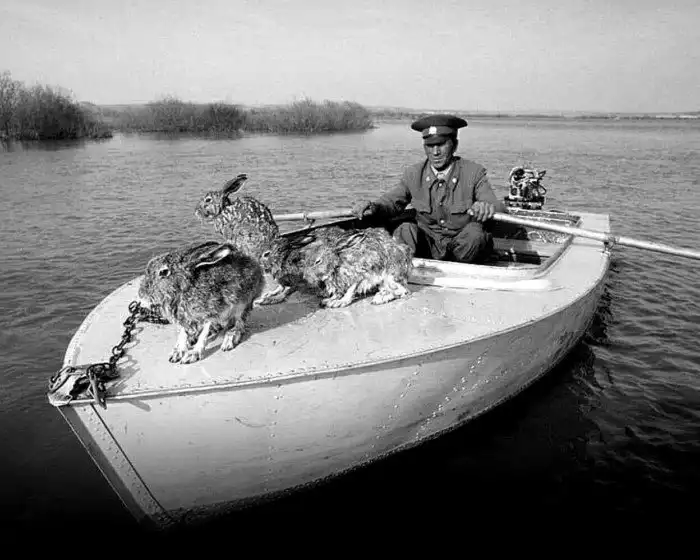 7. Егерь со спасёнными зайцами во время наводнения в Башкирии, 1979 год