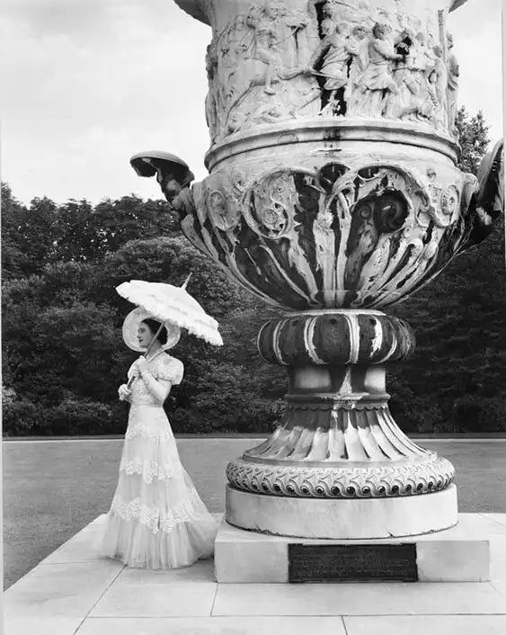 12. Королева Елизавета (королева-мать) с вазой Ватерлоо в саду Букингемского дворца в Лондоне, 1939. Фотограф Сесил Битон