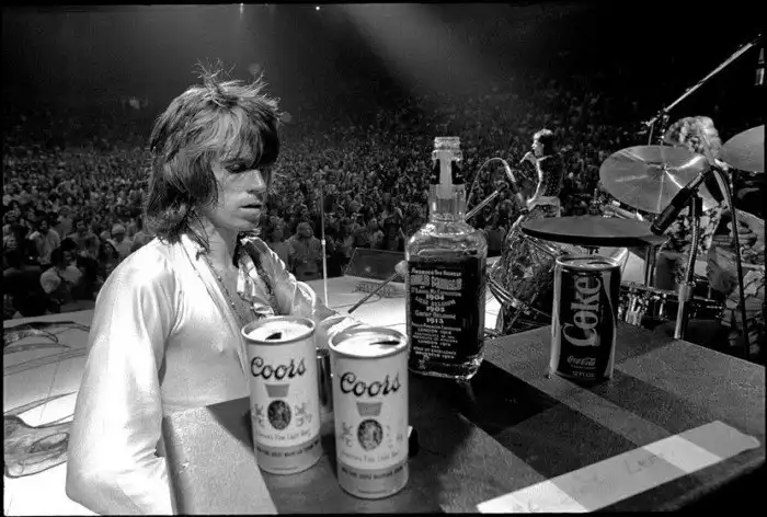 37. Кит Ричардс на сцене с виски и пивом во время американского турне Rolling Stones, 1972. Фотограф Итан Рассел