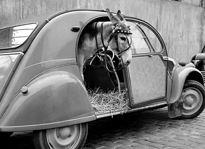 46. Осёл в микролитражном Citroën 2CV. Франция, ок. 1950. Из коллекции агентства Roger Viollet