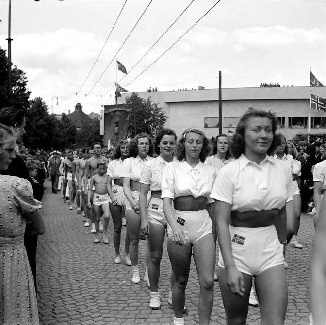 50. Парад на мультиспортивном стадионе «Бислетт» в городе Осло, Норвегия, 3 июня 1945 года. Фотограф Рольф А. Стрём