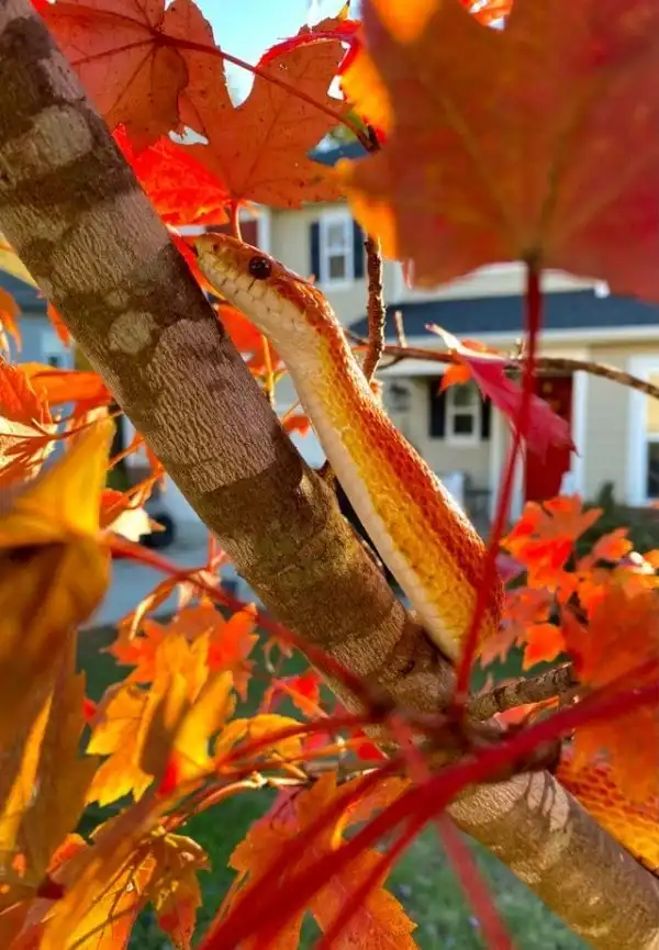 Сфотографировал свою домашнюю змею. Она идеально сочетается с осенними листьями