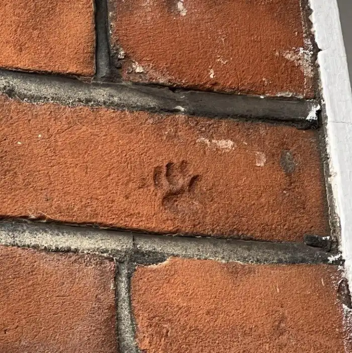«На крыльце моего соседа на лицевой стороне кирпича виден отпечаток лапы животного».