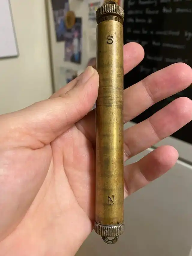 Полая латунная трубка с выгравированной буквой “N” на одном конце, “S” на другом. Я могу открутить колпачок на конце “S”, но не на другом. Найдено на распродаже