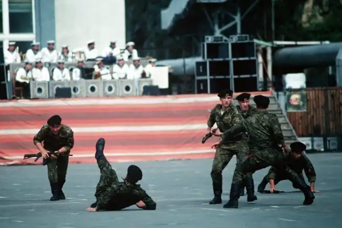 12. Советские морпехи проводят показательный рукопашный бой для гражданских и американских моряков, посетивших Владивосток в рамках программы обмена доброй волей между США и СССР, 1 сентября 1990 года