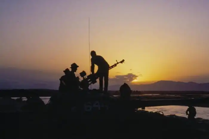 20. Советские танкисты обслуживают технику на фоне заката в Афганистане, сентябрь 1984 года. Фото Александра Земляниченко/AP