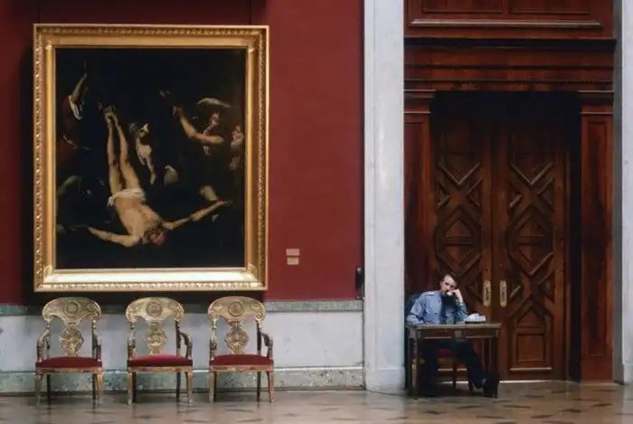 23. Милицейский пост у картины "Распятие Сан-Пьетро" работы Микеланджело Меризи, известного как Караваджо. Государственный Эрмитаж, Ленинград, 1991 год