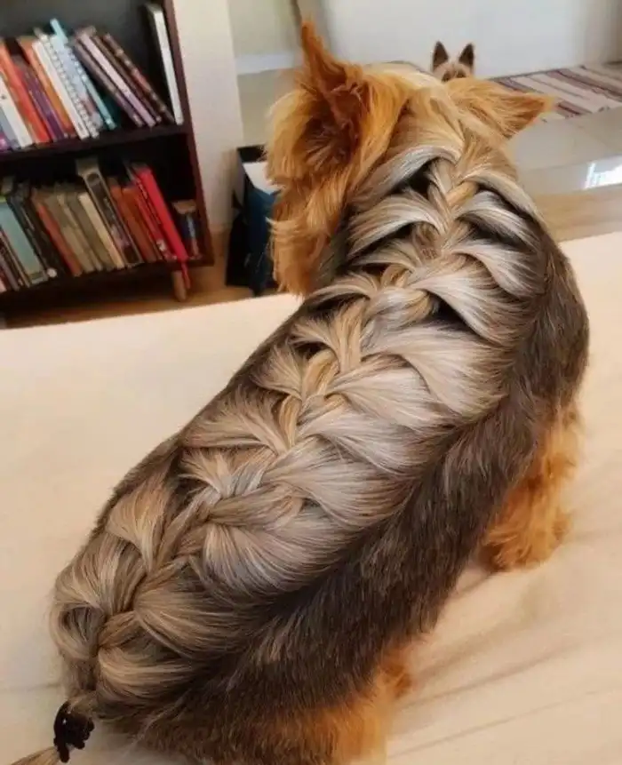 Йорк, шерстка которого заплетена во французскую косу.