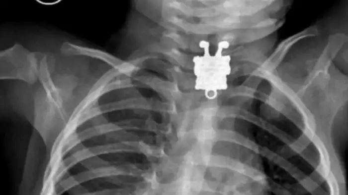 11. Рентгеновский снимок 16-месячного ребенка, проглотившего брелок
