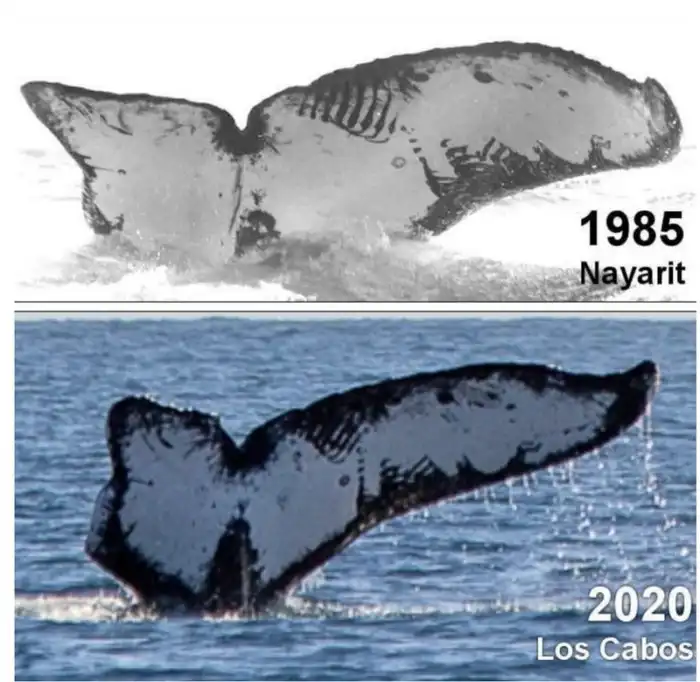 14. Фотографии одного и того же кита, сделанные у побережья Мексики с разницей в 35 лет