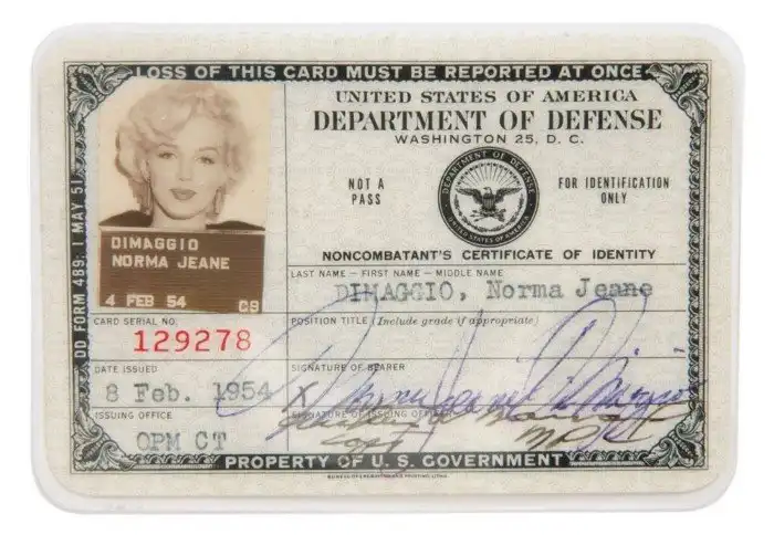 16. Удостоверение личности Нормы Джин ДиМаджио (она же Мэрилин Монро) для Пентагона