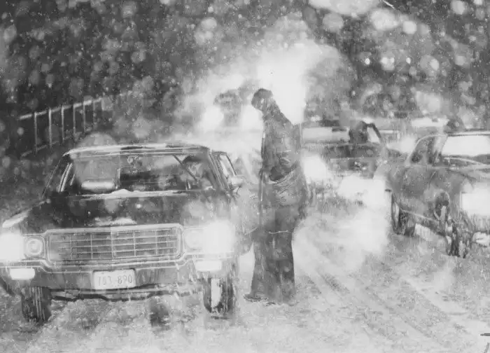 20. 14 ноября 1972 года. Канада. Снежная буря вызвала пробки на шоссе № 10 в районе Брамптона. Фото Dave Norris.