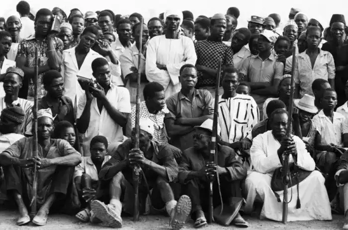 40. Ноябрь 1972 года. Официальный визит президента Франции Жоржа Помпиду в Верхнюю Вольту (ныне Буркина-Фасо). Зрители (и, вероятно, охрана) на маршруте кортежа. Фото Philippe Le Tellier.