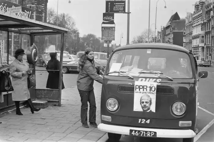 56. 27 ноября 1972 года. Амстердам. Предвыборная кампания. Фургон с плакатом левохристианской PPR.