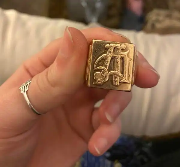 «Кольцо моей бабушки, которое ей досталось от прадеда. Это 14-каратное золото. Затертое клеймо в центре линий — штамп ювелира. Вы можете узнать гораздо больше, если положите кольцо в морозилку. И потом рассмотрите, хорошо увеличив. Холод помогает проявлять следы»